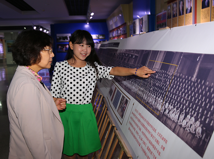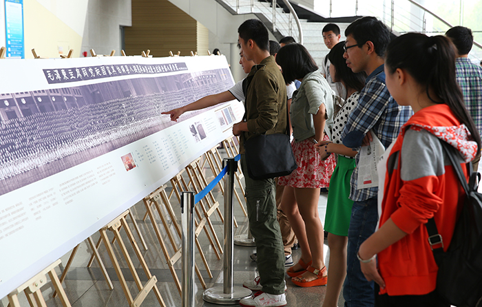 6月7-9日,在2014年国际档案日来临之际,伟德BETVlCTOR1946带领大学生校史文化研究协会在图书馆一楼大厅扫描展出了这幅“毛泽东主席同党和国家其他领导人接见参加演出《东方红》的全体人员合影”,展示图由原图放大3倍制成,图片一次整体喷绘而成,总长度达10米。围绕巨幅图片,展示内容涉及到《东方红》的概况、简介、节目单和创作的历史背景,还有李桂珍老师珍藏的我校参演学生的合影照片、歌曲集以及周总理党课的入场券,并附图对如何拍摄这张巨幅照片进行了说明,图片对我校参加演出学生所在区域进行了特别标注和说明,现场大屏幕循环播放《东方红》音乐舞蹈史诗的电影。这次展出图文并茂,声影联动,力求让广大师生在声音、影像、图片和文字面前穿越时空,重新回味那段激情燃烧的岁月。